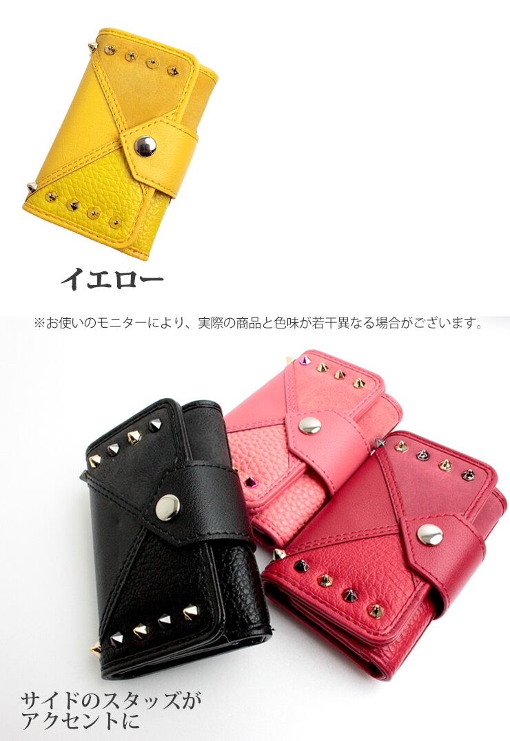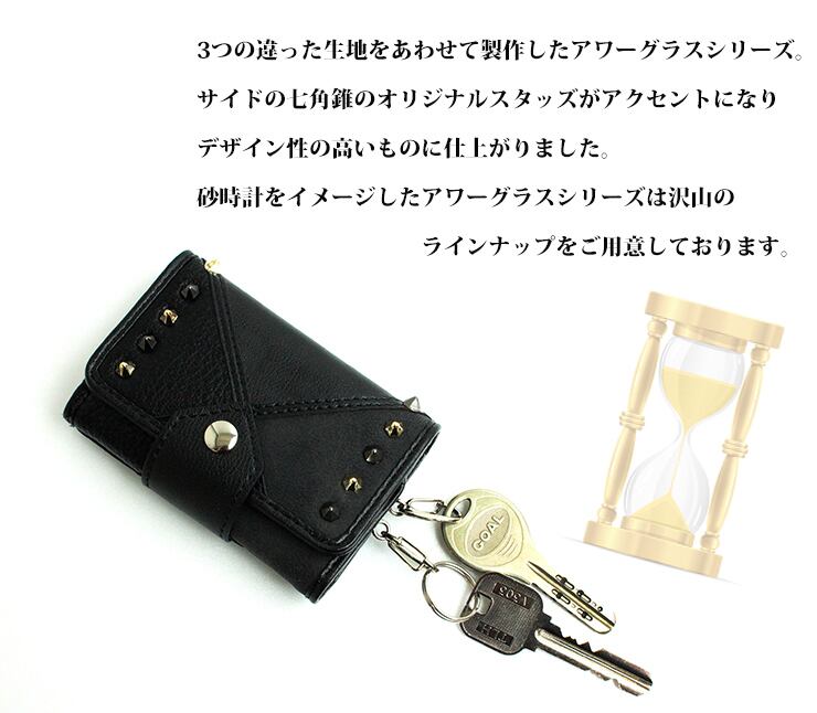 3つの違った生地をあわせて製作したアワーグラスシリーズ。 このアワーグラスシリーズより、6連キーケースが発売致しました。 サイドに散りばめられたオリジナルの七角錐のスタッズがアクセントになりデザイン性の高い物に仕上がりました。 スマートキーや鍵などをオシャレに収納! 【サイズ】約6.5cm×9.7cm 【素材】PUレザー 【カラー】オレンジ/ブラック/ホワイト/ブルー/ピンク/レッド/イエロー