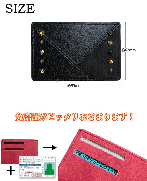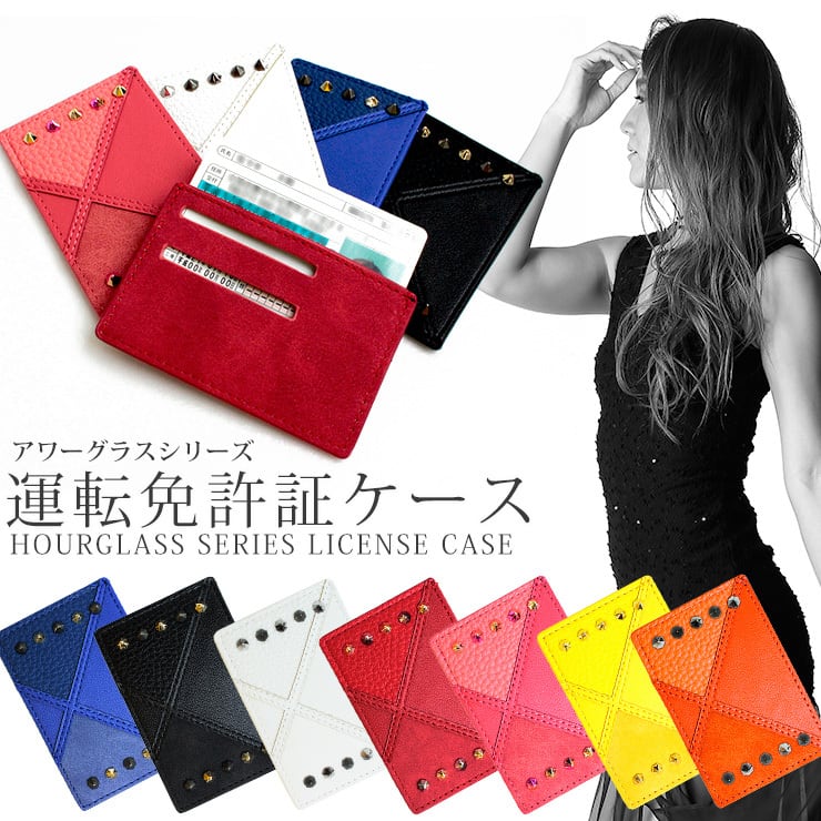 3つの違った生地をあわせて製作したアワーグラスシリーズ。 このアワーグラスシリーズより、運転免許証ケースが発売致しました。 サイドに散りばめられたオリジナルの七角錐のスタッズがアクセントになりデザイン性の高い物に仕上がりました。 ありそうでなかった運転免許証ケース 個人情報を守ってくれる上に、免許証が汚れるのを防ぎます。 ※免許証を入れる際は氏名と有効期限が見えるように押し込んで下さい。 【サイズ】 ・本体外径…約縦62mm×横95mm 【素材】PUレザー 【カラー】オレンジ/ブラック/ホワイト/ブルー/ピンク/レッド/イエロー 画像をよくご確認の上 ご注文下さいますようお願い致します。