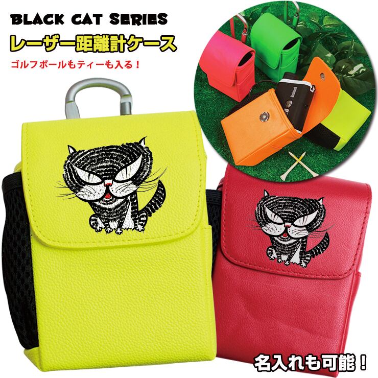 ブラックキャット レザー調 レーザー距離計ケース ゴルフボールもティーも入る! ネコ 猫 黒猫 キャット CAT ゴルフ プロゴルファー ゴルフ用 GOLF Nikon Bushnell STINGER GARMIN ケース 収納 カラビナ