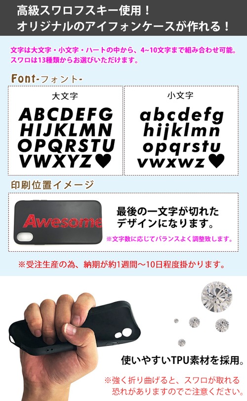 特殊UVプリンターにてご希望の名入れの文字を印刷し、その上に1粒1粒ていねいにスワロを散りばめて 外れにくいように加工しております。