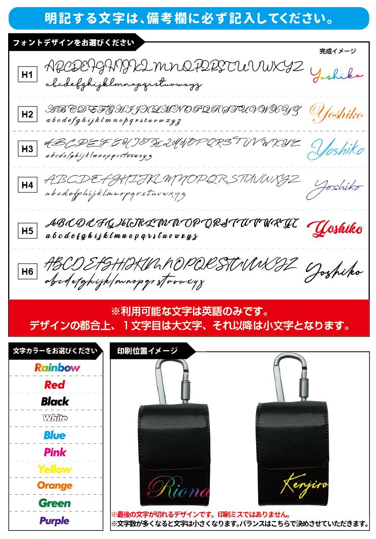 ※名入れする英語とフォントデザインとフォントカラーは必ず備考欄にお書き下さい。(全て大文字や全て小文字でご入力いただいても、1文字目は大文字、それ以降は小文字となります。)