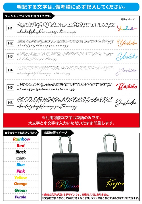 ※名入れする英語とフォントデザインとフォントカラーは必ず備考欄にお書き下さい。(大文字と小文字もそのままプリントするのでお間違いないようお願いします。)