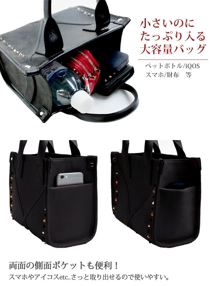 3つの異なる生地を組み合わせ、両サイドにスタッズをあしらった