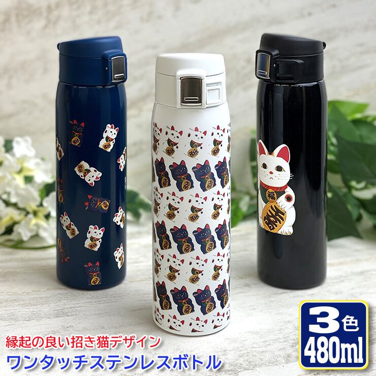 招き猫デザイン ワンタッチカービングサーモボトル 480ml (全3色)