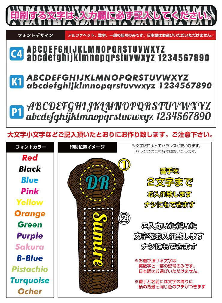 全面印刷 アニマルパターン ゴルフヘッドカバー 単品 世界でたった一つのオリジナルゴルフヘッドカバー お好きな文字やカラーを選択して、自分だけのオリジナルに♪ 完全オーダーメイド!プレゼントにも最適です☆ ※名入れする文字は必ず備考欄にお書き下さい。 【種類/サイズ】 ・DR(縦36cm×幅18cm):460cc対応 ・FW(大)(縦31cm×幅14cm):#2・3・4・5・X 対応 ・FW(小)(縦31cm×幅12cm):#2・3・4・5・X 対応 ・UT(縦27cm×幅11cm):#2・3・4・5・X 対応 ※サイズは必ずご確認下さい。 【素材】PVCレザー ※こちらの商品は完全受注生産品となります。 (7~10営業日ほどで発送します。) 注文する際の備考欄にこちらをご記入下さい↓ ----------------- アニマルパターン【 】 【2】名入れ文字をご記入下さい→【 】 【2】名入れ文字カラー【 】 【1】番手の文字をご記入下さい(2文字まで)→【 】 【1】番手文字カラー【 】