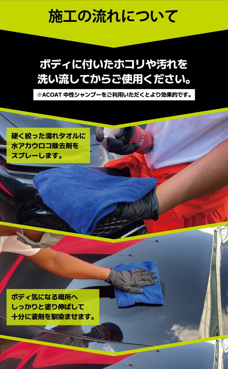 このA-COAT 水垢・ウロコ除去はプロの仕様でありながら、誰でも簡単に使用できる洗車用品です。