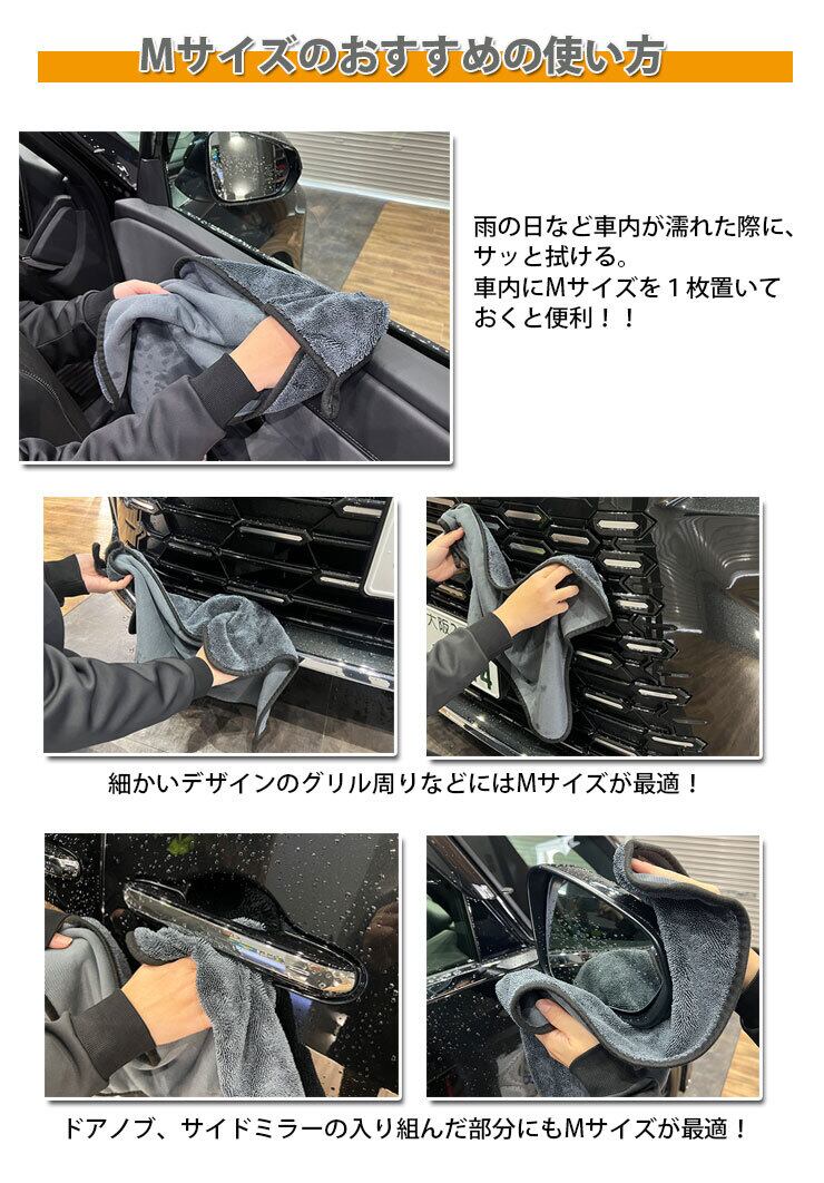 Lサイズの方は、大判サイズで素早く拭き上げができるのでSUVなどの大きなボディのドライングに最適です。拭き上げ時間短縮で作業効率もアップ。片面設計になっているので大判でも軽くてしなやかな拭き心地を体感できます。